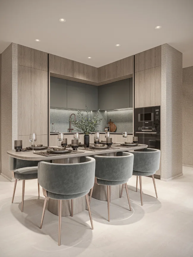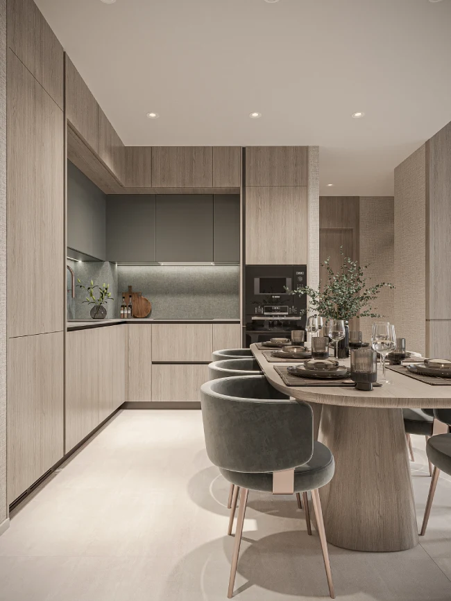 Das Projekt wurde als intime, überschaubare Community konzipiert und umfasst eine limitierte Auswahl an 1-, 2- und 3-Bedroom-Apartments sowie wenige Townhouses. Die Architektur ist zurückhaltend und elegant, geprägt von klaren Linien, großzügigen Balkonen und bodentiefen Glasflächen. Innenräume greifen die Sprache des Küstenlebens auf: warme Holzoberflächen, hochwertige Materialien und fein abgestimmte Texturen schaffen eine Atmosphäre, die Leichtigkeit und Substanz verbindet. Die Grundrisse sind offen und großzügig gestaltet, mit einem klaren Fokus auf Licht, Raumgefühl und Alltagstauglichkeit.